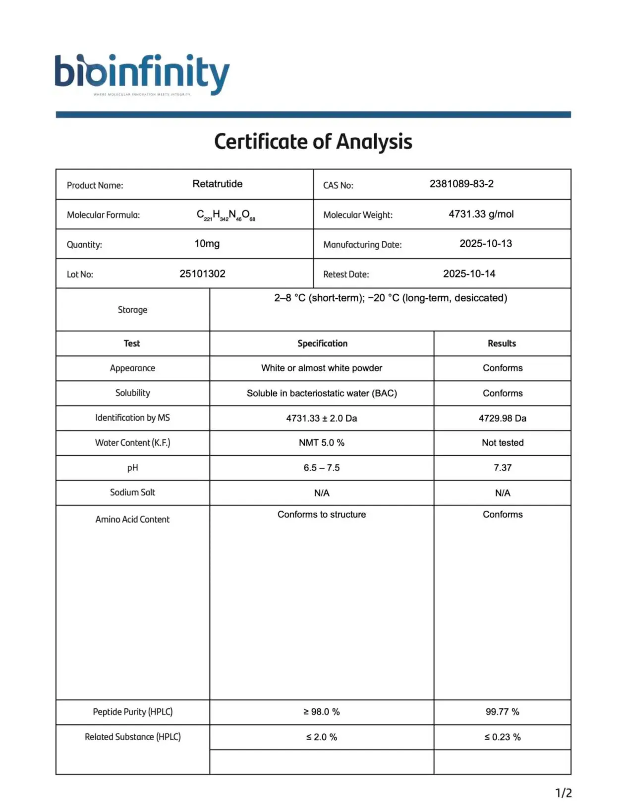 GLP3-R Single Peptide | 25101302 | 99.77% | Oct 14, 2025 | BioInfinity QA | |