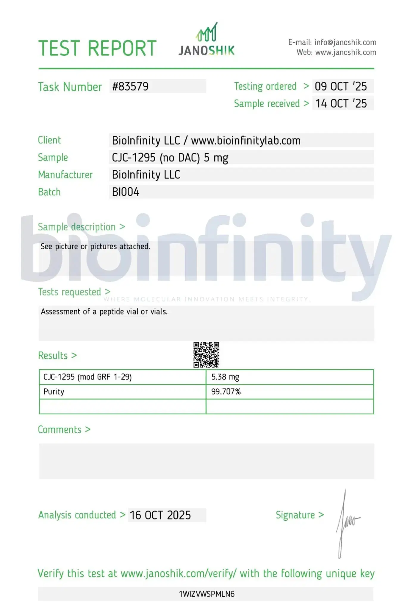 CJC-1295 no DAC Single Peptide | BI004 | 99.707% | Oct 16, 2025 | Janoshik Analytical | |