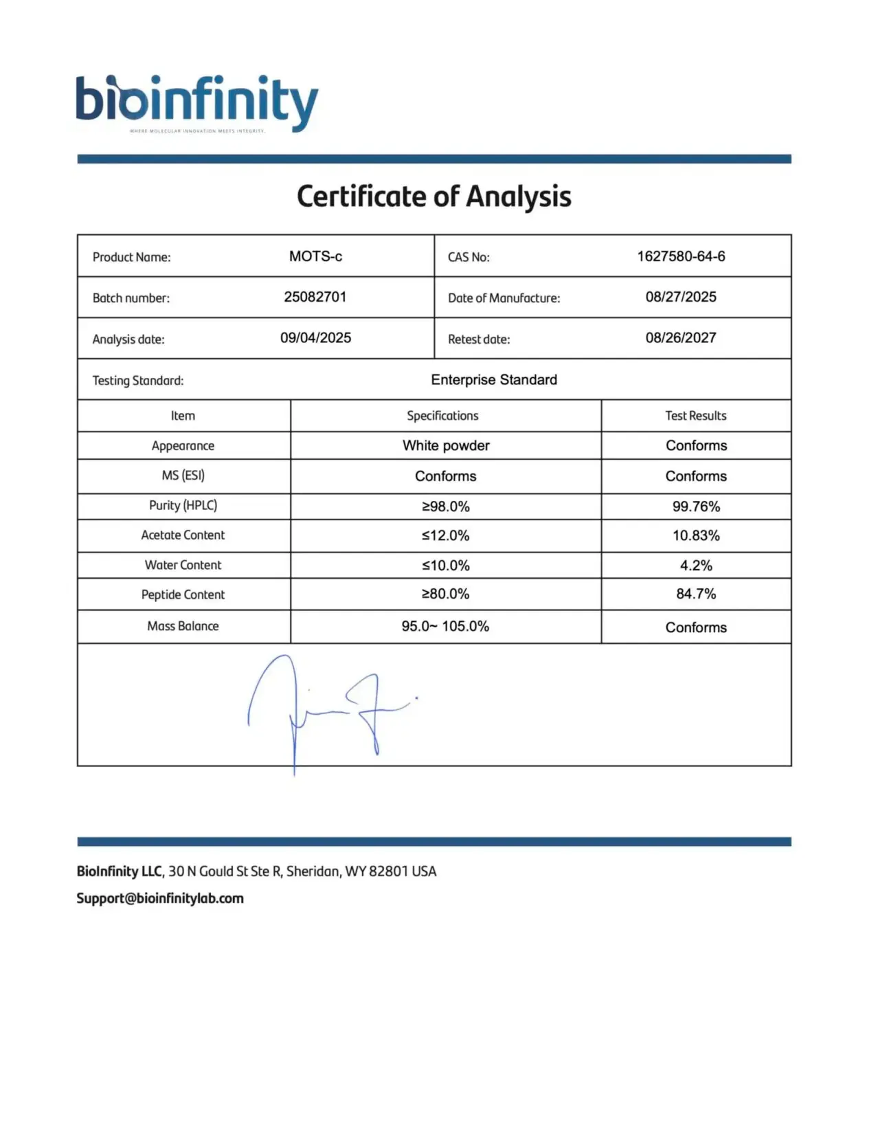 MOTS-c Single Peptide | 25082701 | 99.76% | Sep 04, 2025 | BioInfinity QA | |