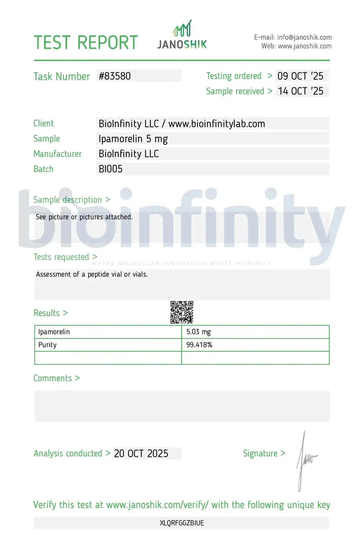 Ipamorelin Single Peptide | BI005 | 99.418% | Oct 20, 2025 | Janoshik Analytical | |
