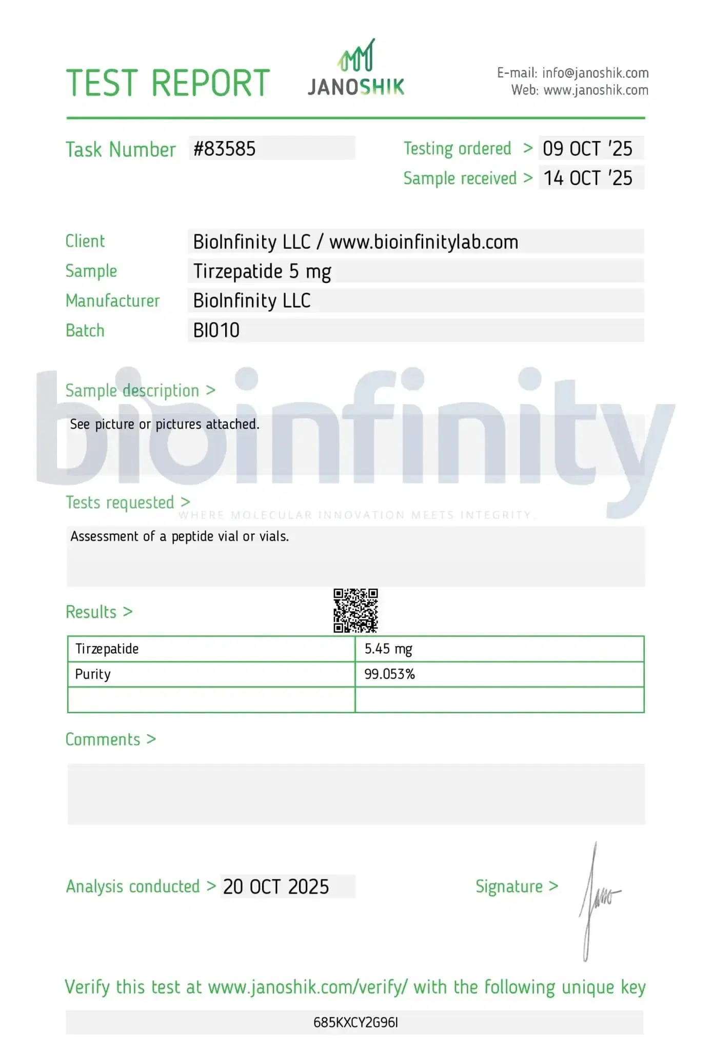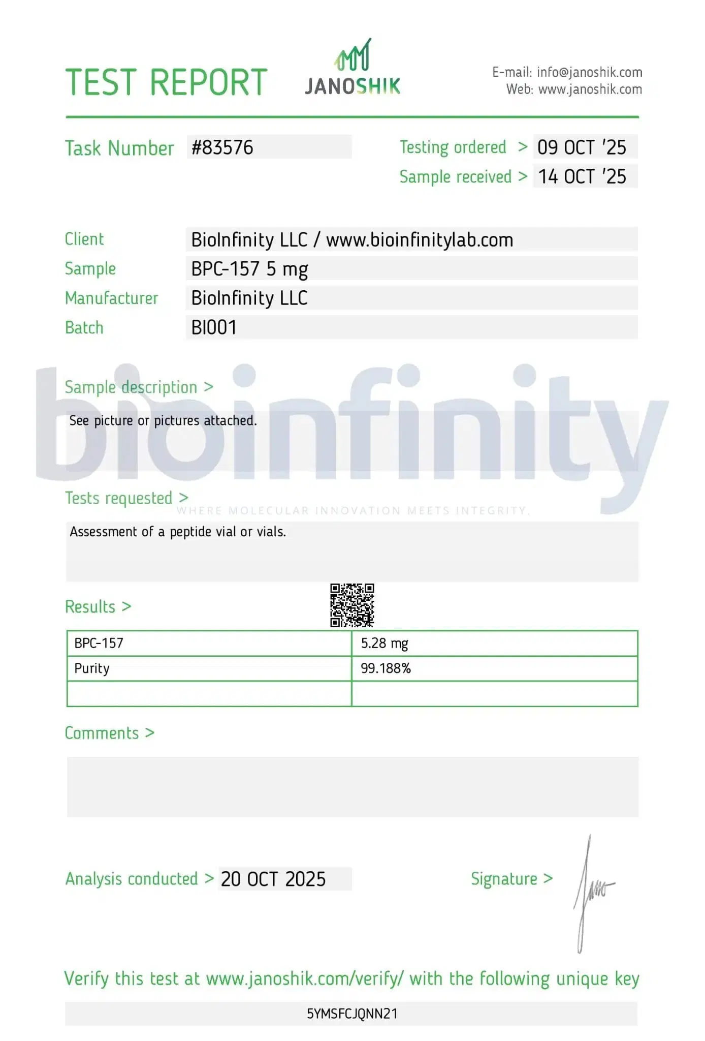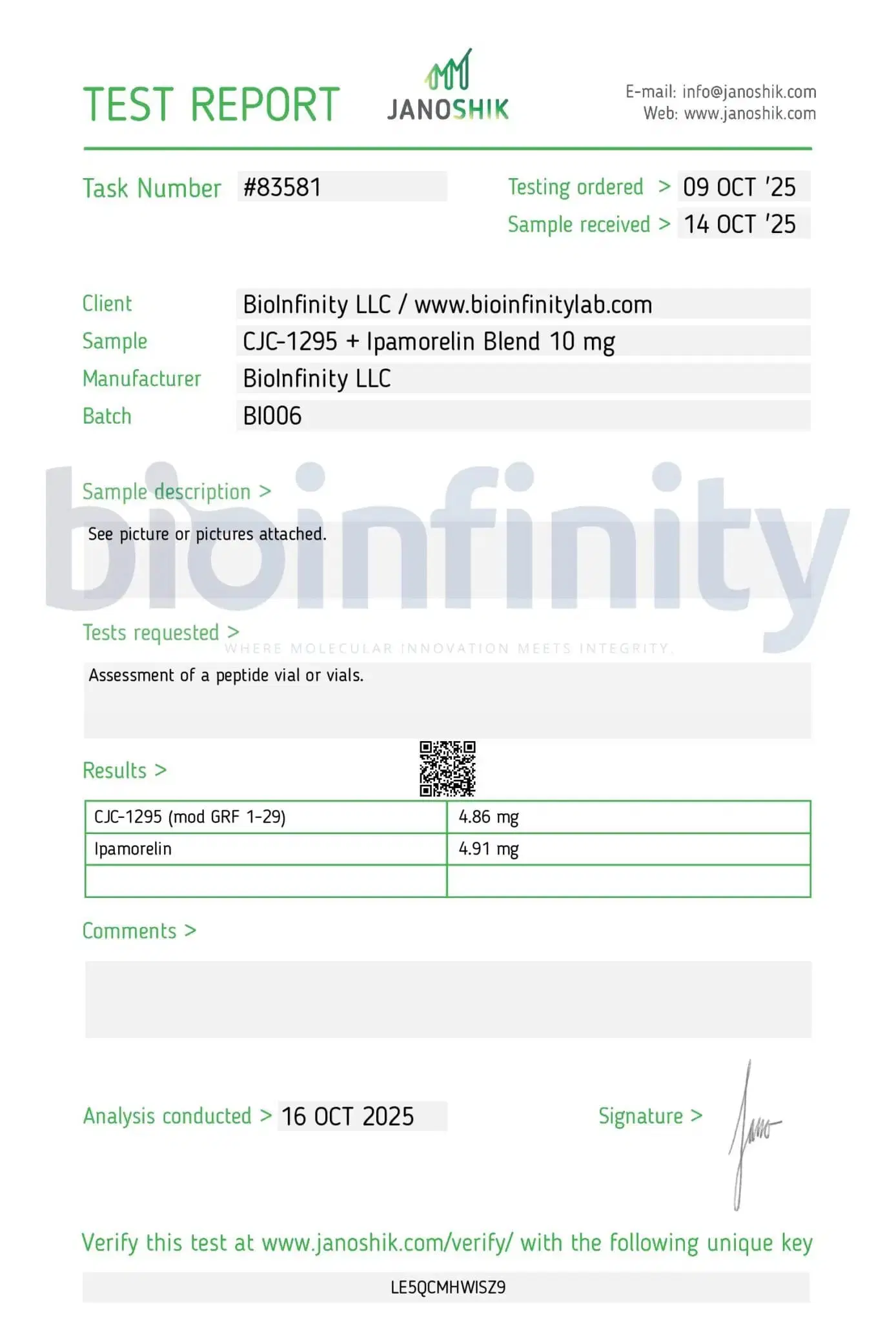 | BI008 | CJC: 99.567%, Ipamorelin: 99.418% | Oct 20, 2025 | Janoshik Analytical | ||