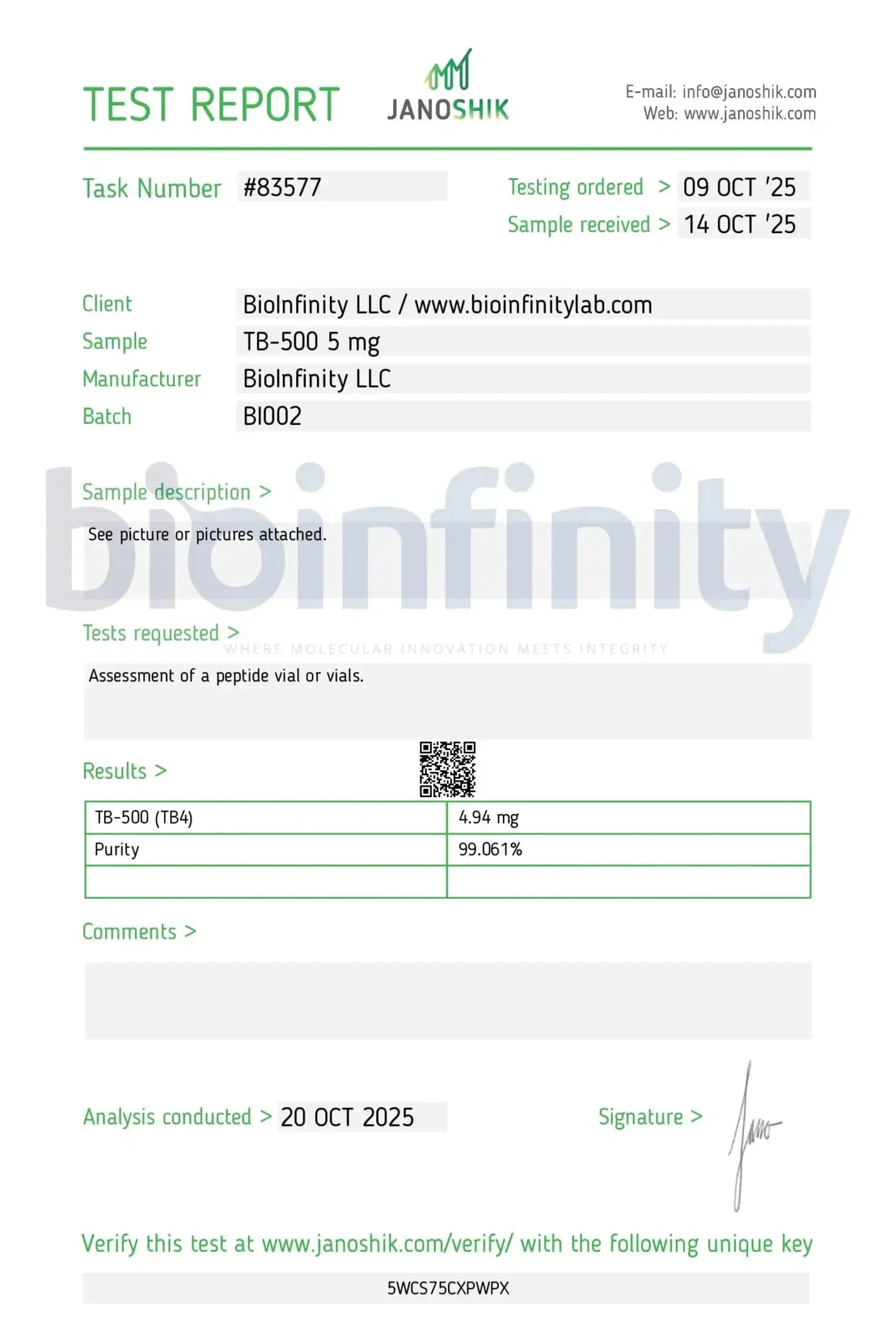 TB-500 (TB4) Single Peptide | BI002 | 99.061% | Oct 20, 2025 | Janoshik Analytical | |