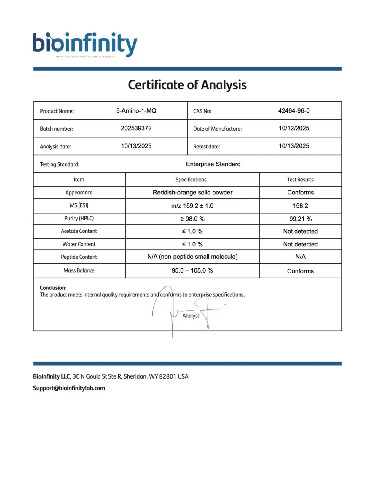 5-Amino-1MQ Single Peptide | 202539372 | 99.21% | Oct 13, 2025 | BioInfinity QA | |