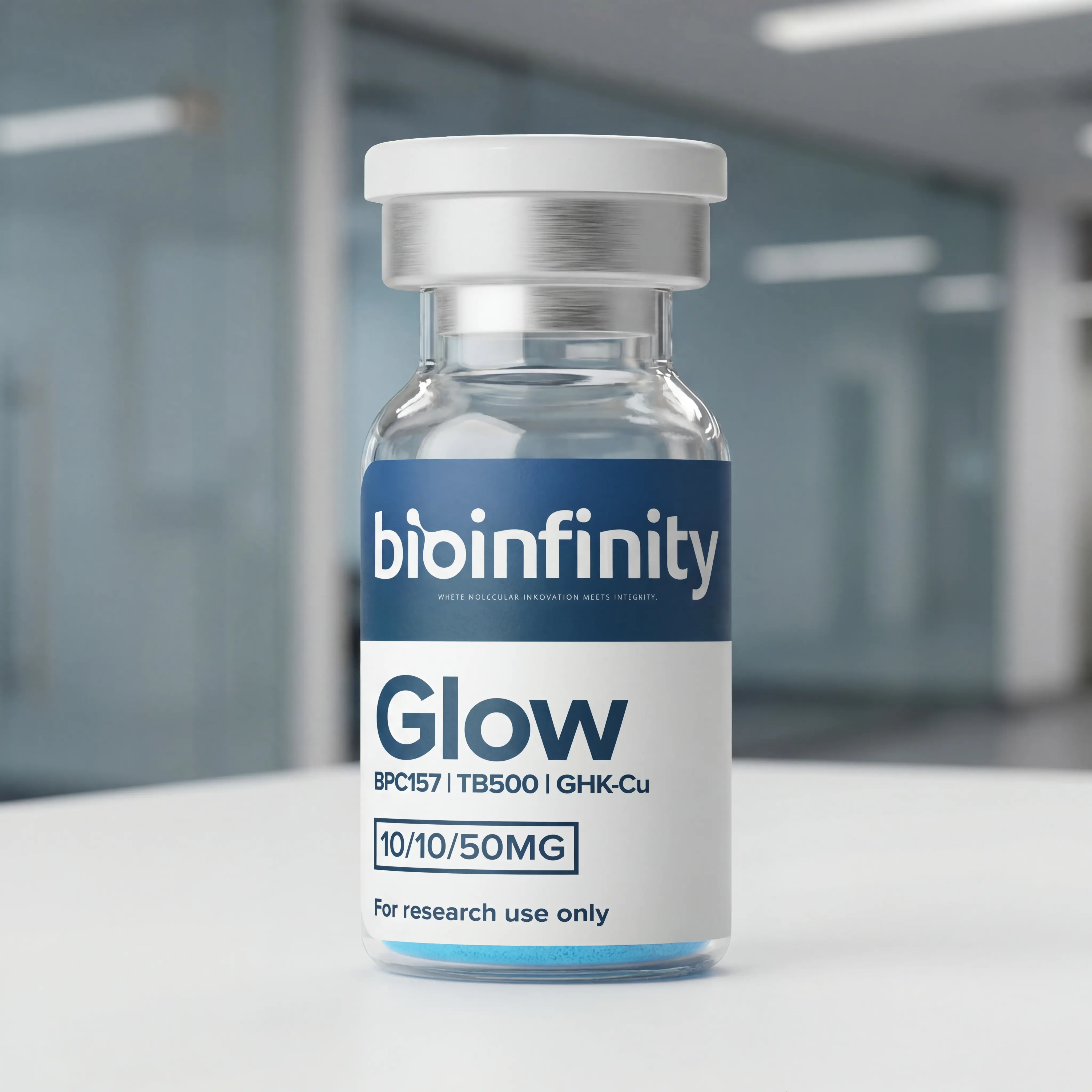 Glow Blend is a multi-peptide research formulation combining GHK-Cu (Copper Peptide), Epithalon, and additional bioactive peptides selected for their complementary mechanisms in skin biology, cellular regeneration, and anti-aging research. This blend leverages the synergistic effects of collagen-stimulating, telomerase-activating, and antioxidant peptides.